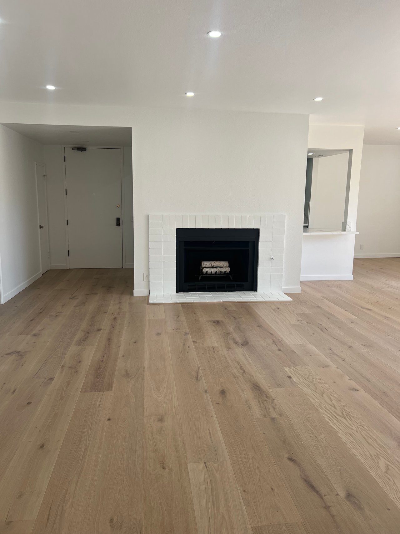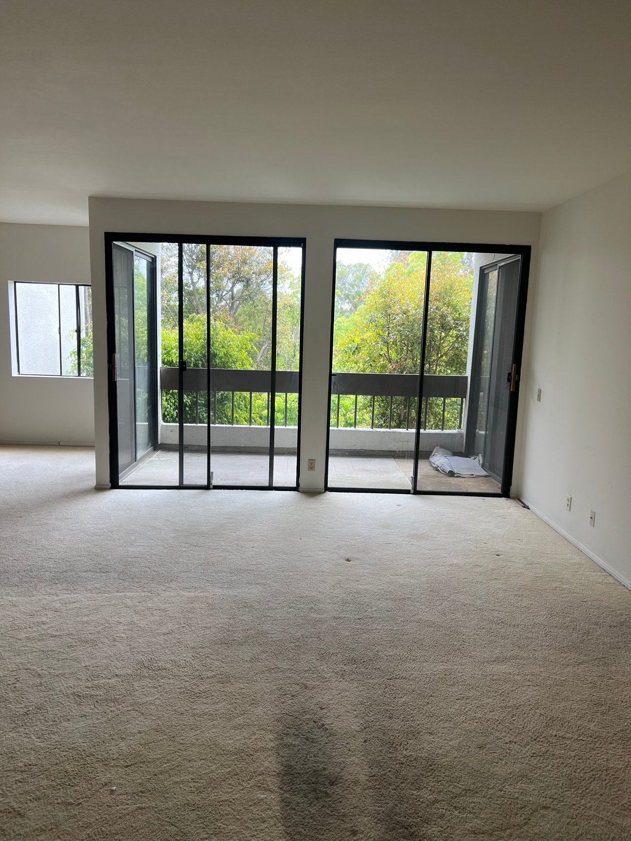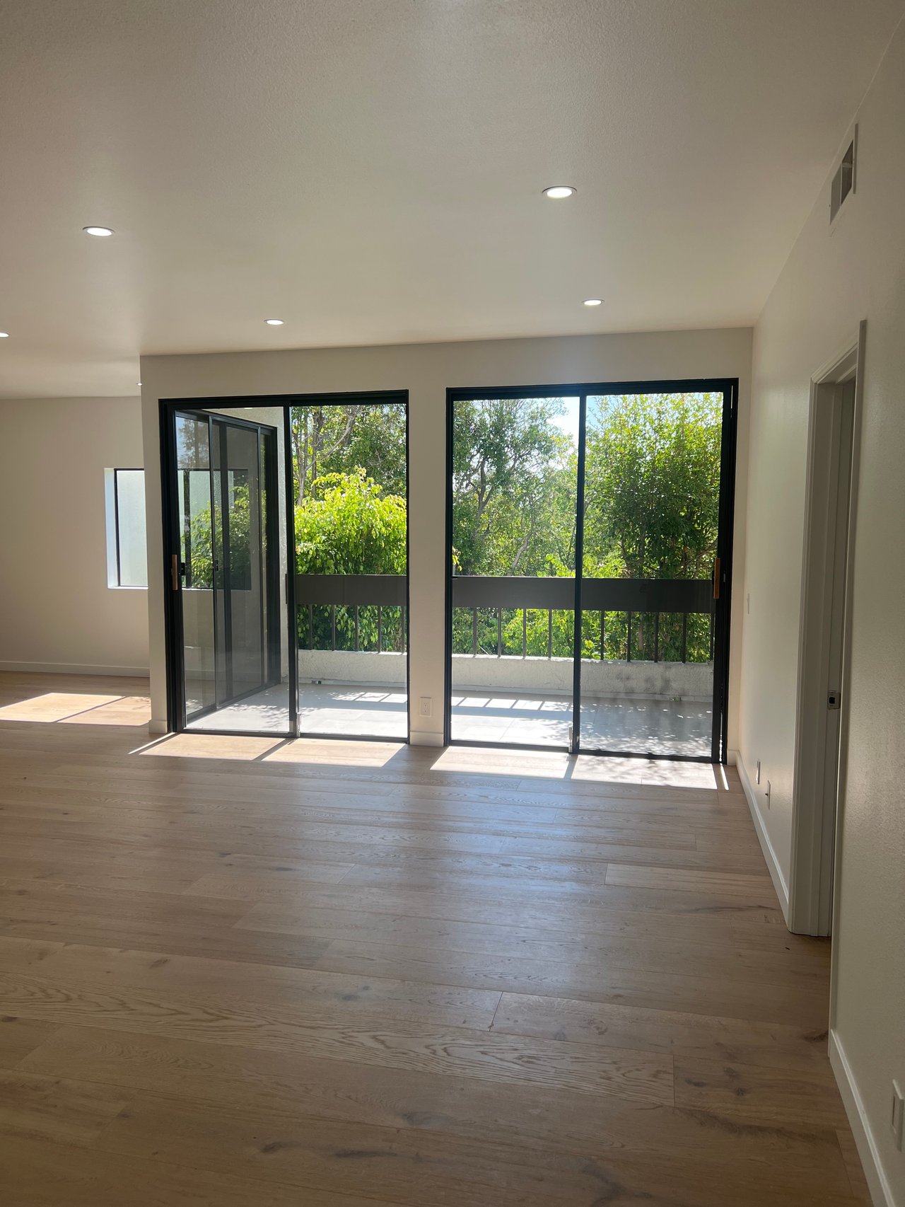 Carpet was replaced with luxury wide-plank European oak engineered flooring, complemented by neutral tile throughout the balcony, kitchen, and baths. The kitchen was fully redesigned with custom cabinetry, quartz countertops, and all-new stainless-steel appliances. The primary bath was reconfigured by removing the original sunken tub to create space for a floating soaking tub and a custom navy double vanity inspired by Azul Calcutta quartz. The second bath was fully modernized with a new vanity, updated tile, and a sleek half-glass shower enclosure, and the den was converted into a full 3rd bedroom, by creating a wall with a pocket door, completing the home’s elevated, contemporary transformation.
