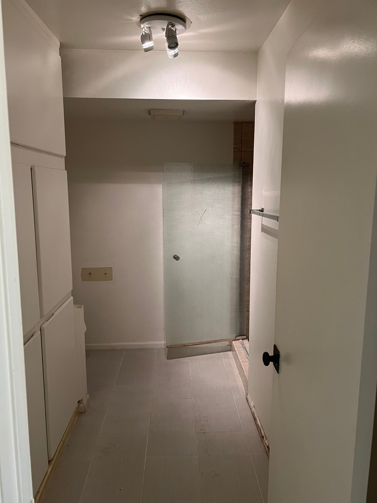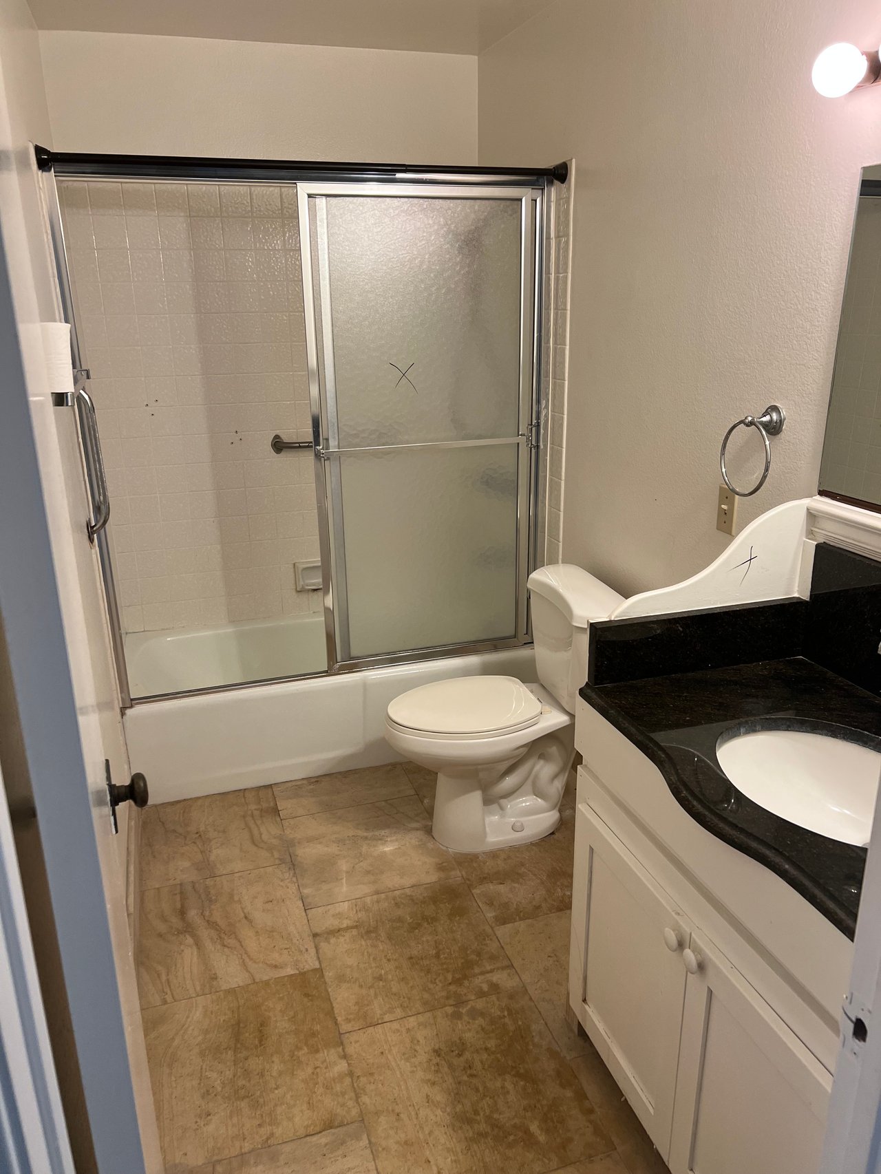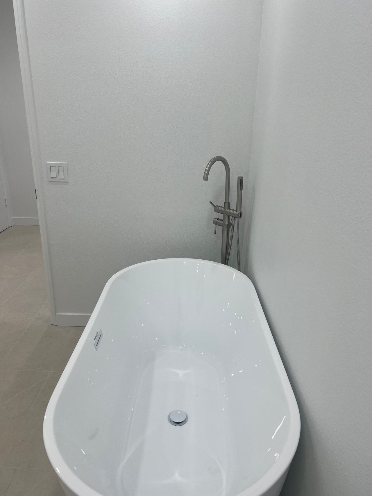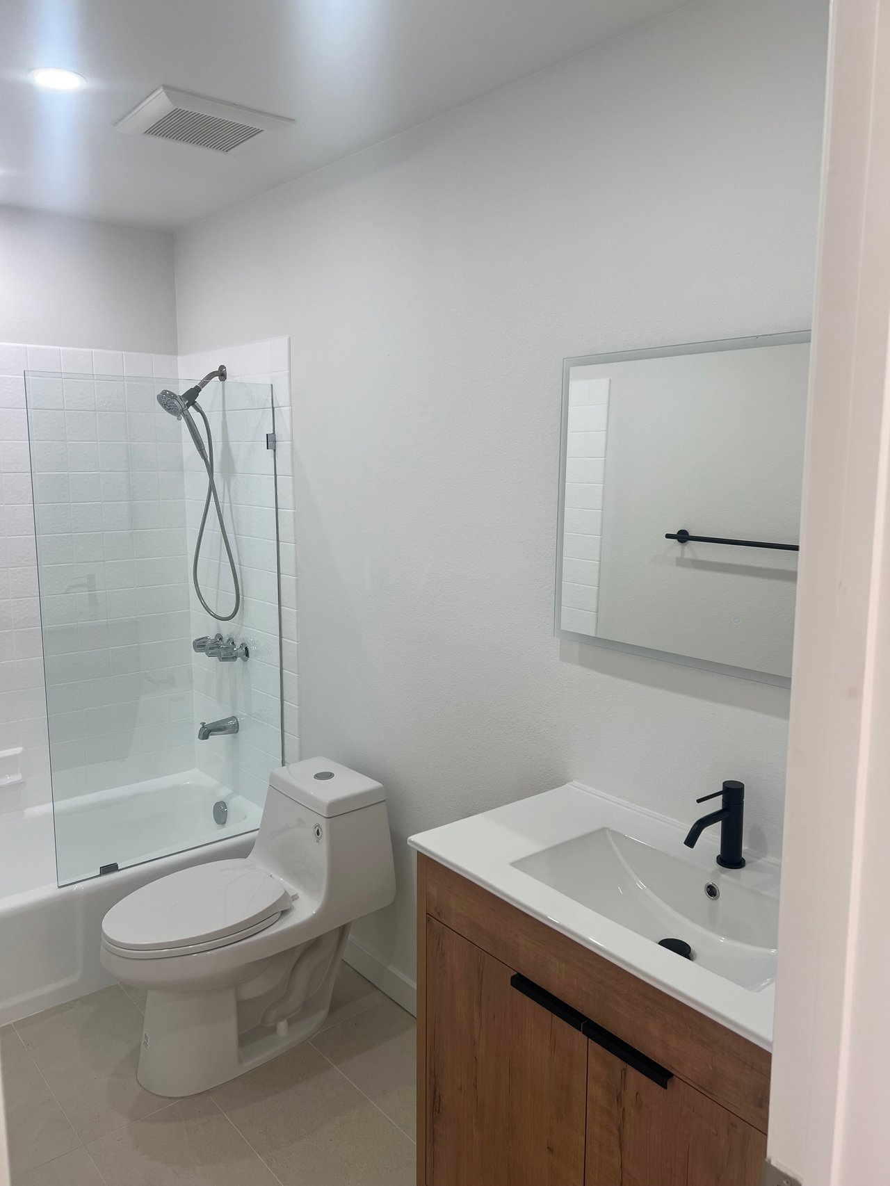 Carpet was replaced with luxury wide-plank European oak engineered flooring, complemented by neutral tile throughout the balcony, kitchen, and baths. The kitchen was fully redesigned with custom cabinetry, quartz countertops, and all-new stainless-steel appliances. The primary bath was reconfigured by removing the original sunken tub to create space for a floating soaking tub and a custom navy double vanity inspired by Azul Calcutta quartz. The second bath was fully modernized with a new vanity, updated tile, and a sleek half-glass shower enclosure, and the den was converted into a full 3rd bedroom, by creating a wall with a pocket door, completing the home’s elevated, contemporary transformation.